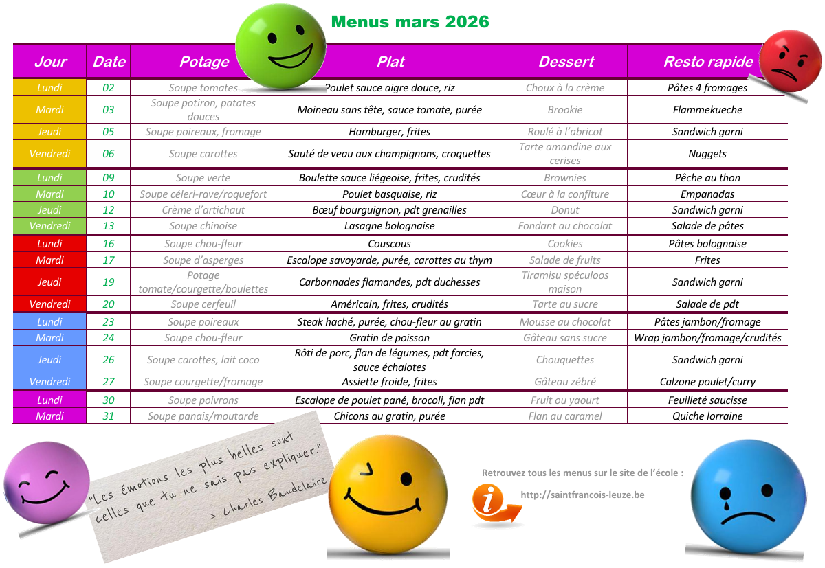Menus élèves février 2026 Publié le 2 mars 2026 Publié dans Communication Le menu « élèves » du mois de mars 2026 est disponible. Vous pouvez le consulter et le télécharger ci-dessous. Téléchargements MarsAjouté le: 2 mars 2026 10 h 13 min Taille: 349 KB Téléchargements: 2