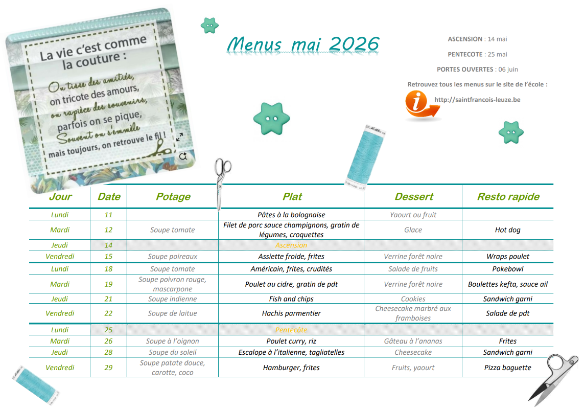 Menus élèves mai 2026 Publié le 24 avril 2026 Publié dans Communication Le menu « élèves » du mois de mai 2026 est disponible. Vous pouvez le consulter et le télécharger ci-dessous. Téléchargements MaiAjouté le: 24 avril 2026 10 h 52 min Taille: 406 KB Téléchargements: 2